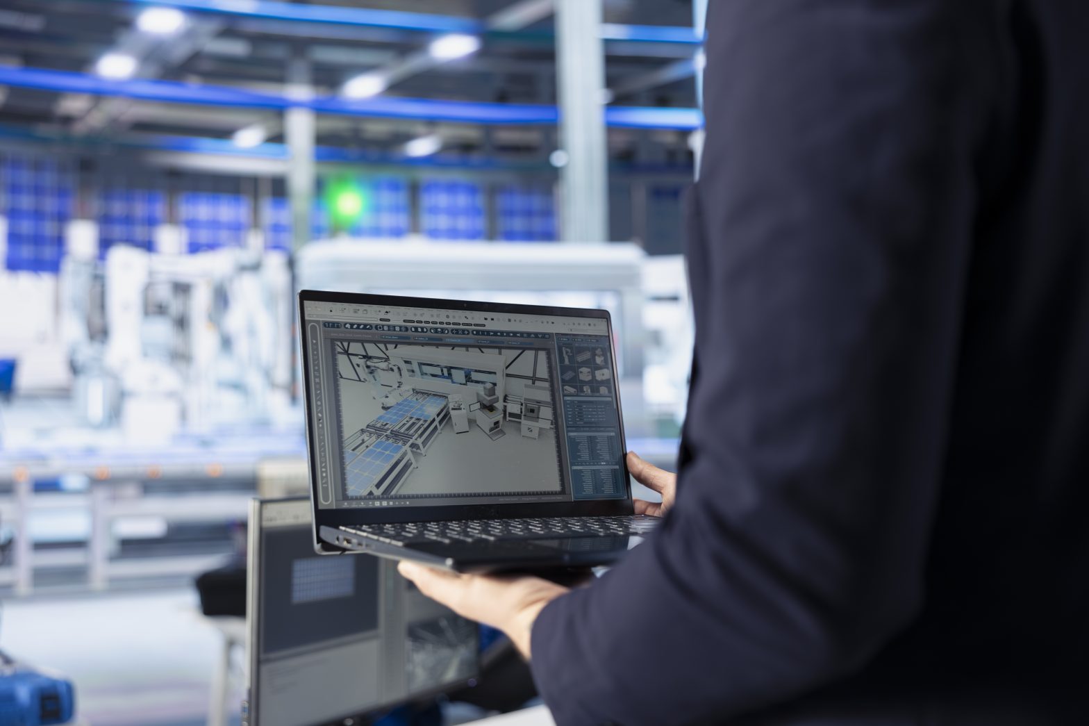 Engineer in photovoltaics factory using tracking software on laptop to diagnose malfunctioning systems. Solar panels manufacturing plant worker uses notebook to reduce downtime
